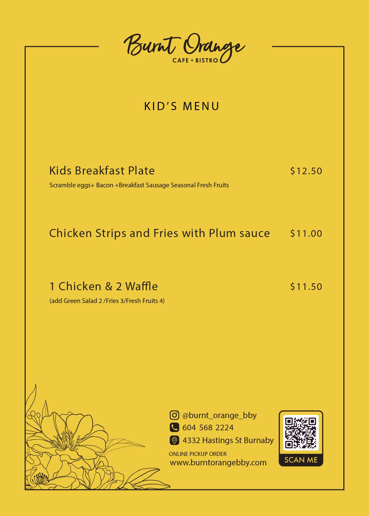 Welcome to Burnt Orange, where our specialty fluffy pancakes, alongside the finest 49 parallel coffee, brunch, and lunch, are sure to delight your taste buds. Whether you're starting your day or enjoying a midday meal, we've got you covered with our delicious offerings.